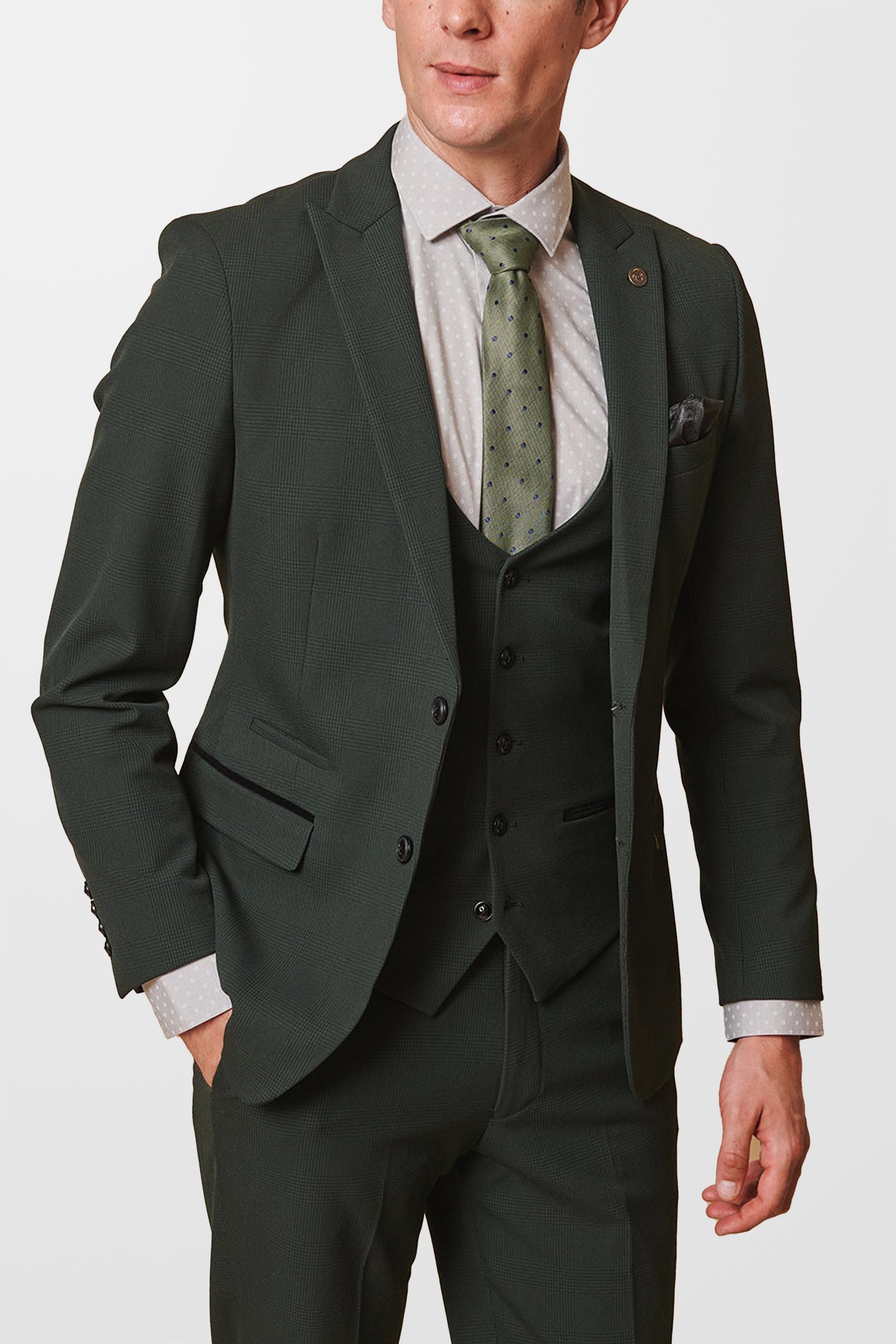 The Bromley Olive Check Blazer is a classy tailored designed for the modern gentleman. Perfect for weddings and other formal events, this 3-piece suit exudes timeless sophistication with its classic Prince of Wales check pattern and rich olive green hue that complements any polished look.